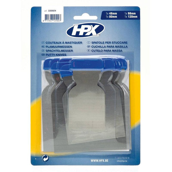 Jeu de 4 couteaux en métal et matière synthétique, résistant aux solvants. Facilite l’application de mastic.
