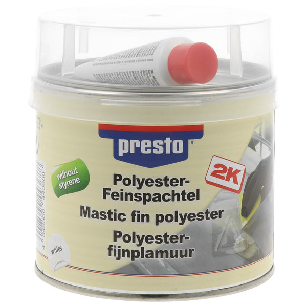 Mastic fin polyester très souple, bicomposant pour le remplissage de petits défauts de planéité ou pour le « masticage de finition » de surfaces préalablement traitées. S'adapte aux supports en métal, bois, béton sur des surfaces préparées avec le mastic de remplissage Presto. Une application rapide est possible grâce au durcissement rapide. On obtient une surface très lisse grâce aux agents de remplissage microfins.