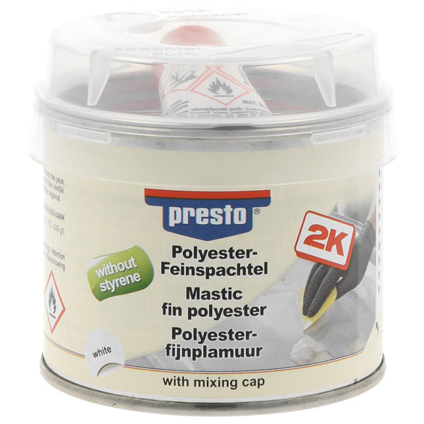 Mastic fin polyester très souple, bicomposant pour le remplissage de petits défauts de planéité ou pour le « masticage de finition » de surfaces préalablement traitées. S'adapte aux supports en métal, bois, béton sur des surfaces préparées avec le mastic de remplissage Presto. Une application rapide est possible grâce au durcissement rapide. On obtient une surface très lisse grâce aux agents de remplissage microfins.